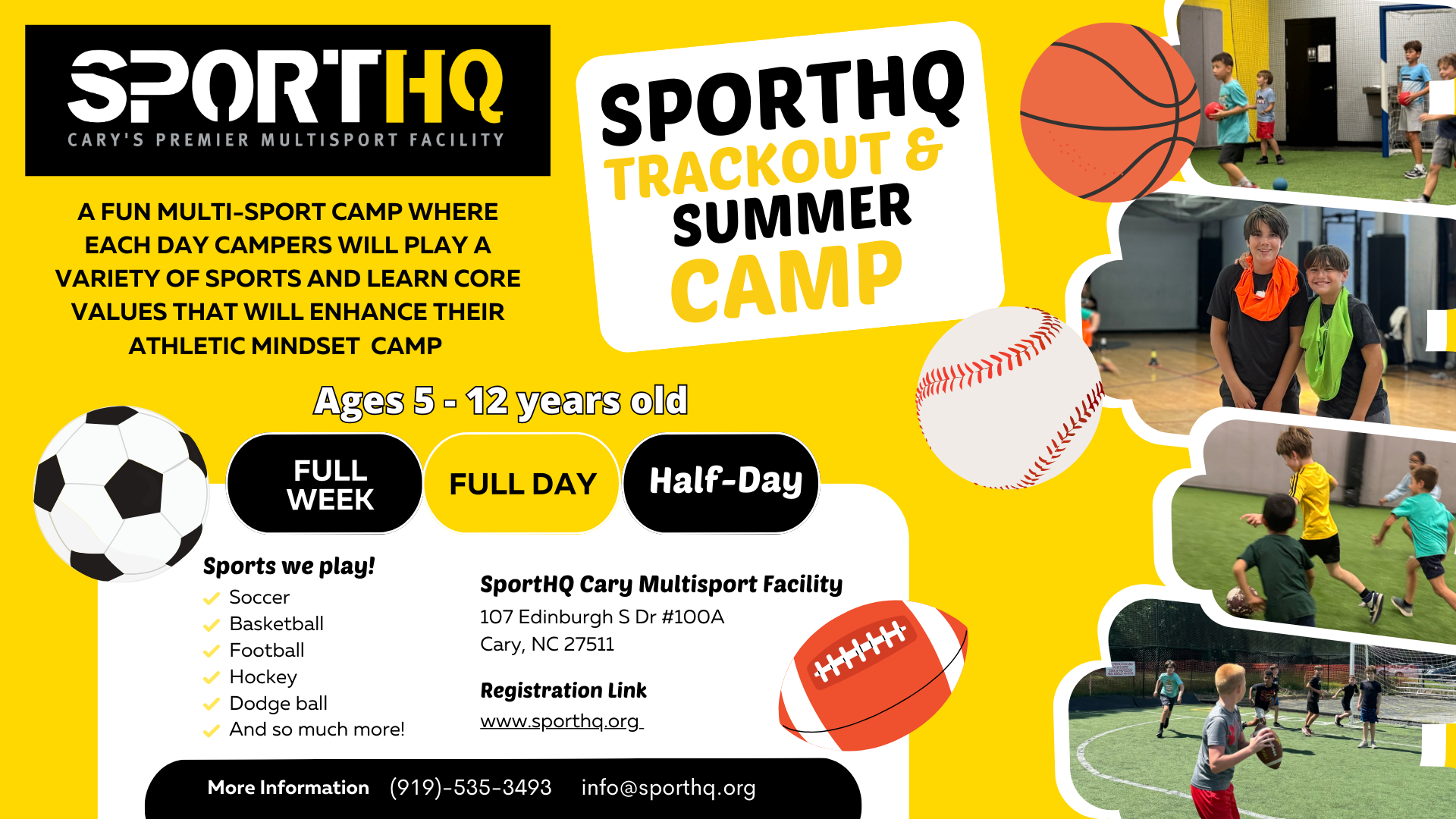 Sports include soccer, basketball, flag football, dodgeball, and more—all led by experienced high school and college-aged athletes.